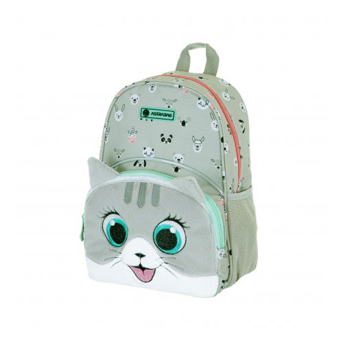 Hatalmas szemű, cuki kiscica díszíti ezt a kislányoknak készült ovis hátizsákot. Az első kisebb zseb szőrmés anyagú, oldalán kedves kisállatok láthatók.