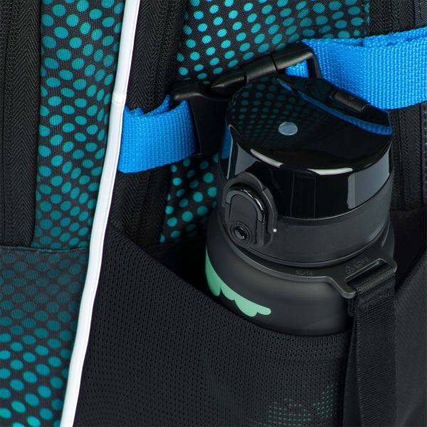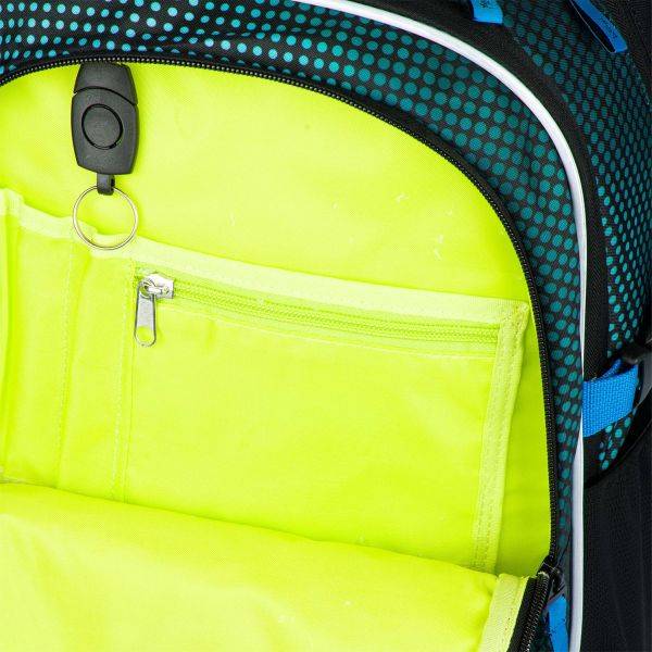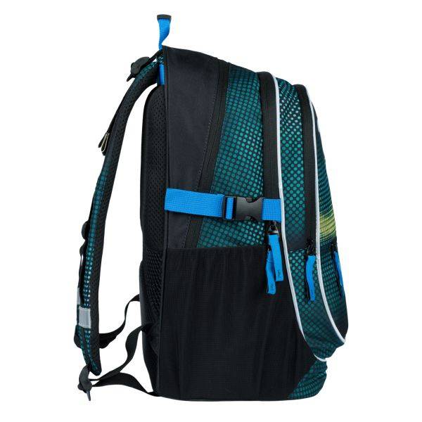 A kék, zöld színvilágú, sportos iskolatáska szett része az ergonomikus iskolatáska, az ovális tolltartó és a tornazsák.