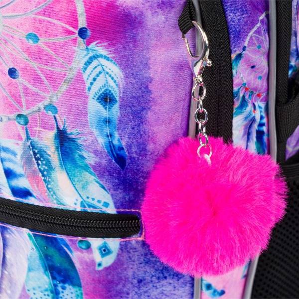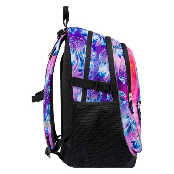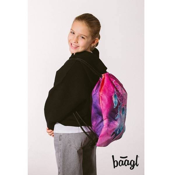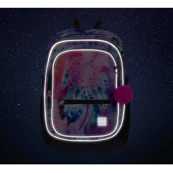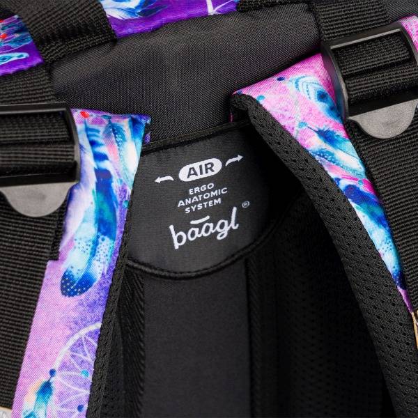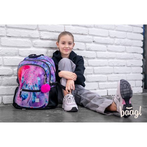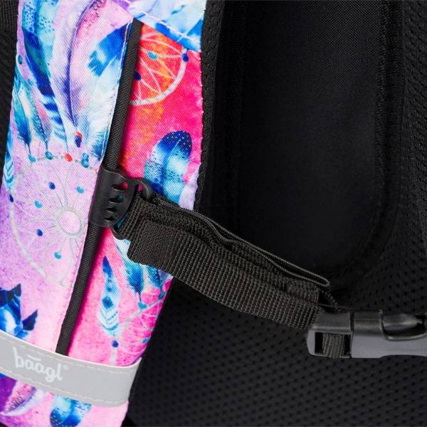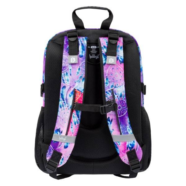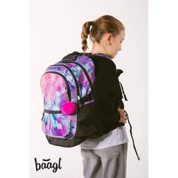 Az ergonomikus iskolatáska indiános motívummal díszített. A Baagl hátizsák lila, kék és rózsaszín színvilágú, elején egy álomfogó látható. Strapabíró és praktikus iskolatáska anatómiai hátkiképzéssel, magasságtól függően 3. osztályos kortól ideális választás.