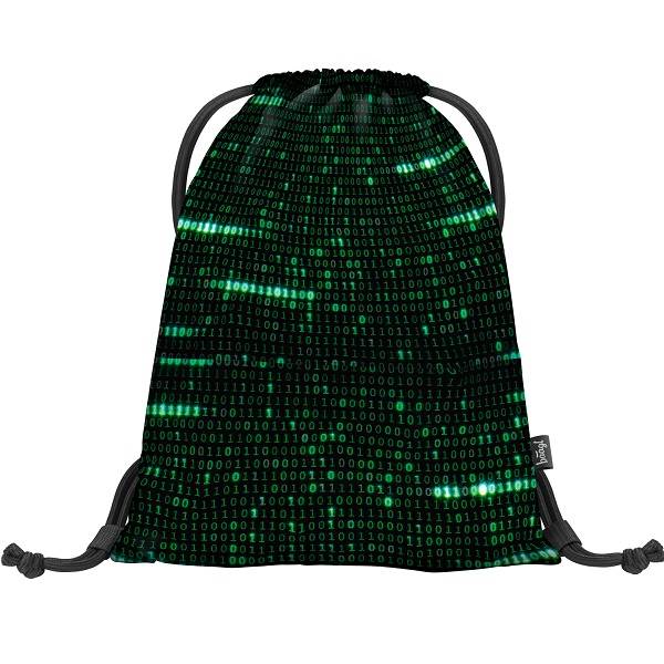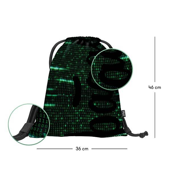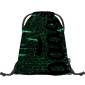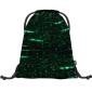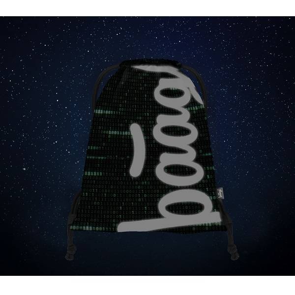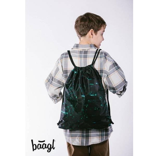 Baagl felirat és a digitális viágos idéző geometriai minta díszíti ezt a zöld színvilágú Baagl tornazsákot.