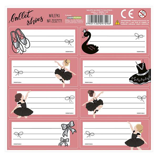 Látványos rózsaszín és fekete balerinás minta látható a füzetcímke oldalán.