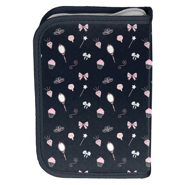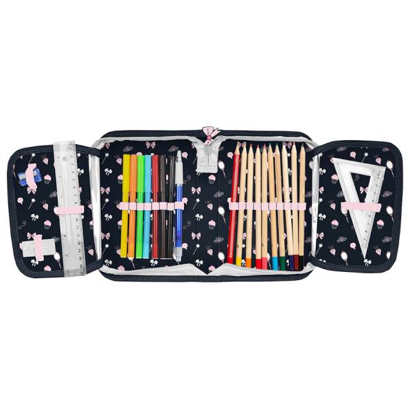 A tolltartó mintás belsejében gumipántokkal rögzíthetőek az írószerek, hogy a rend nem csak a fejekben, de a tolltartóban is meg legyen. A belső részen 18 db gumipánttal rögzíthetőek a ceruzák. Két kihajtható füllel rendelkezik, az itt található gumipántok alá radír, faragó, vonalzó rögzíthető, a fóliás zsebekbe órarendet tudsz csúsztatni.