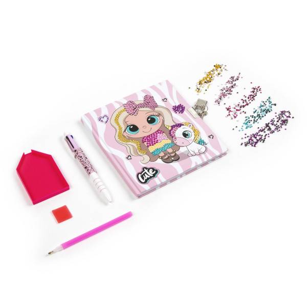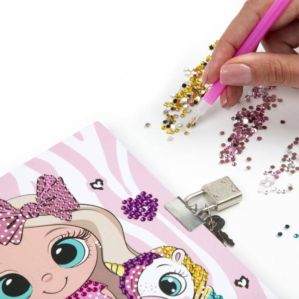 A készlet része egy háromszínű golyóstoll (piros, kék, fekete), amely stílusában harmonizál a naplóval. A csomagban található továbbá 500 darab színes gyémánt matrica, egy tálca, egy felszedő toll és viasz, amelyekkel a gyermekek saját fantáziájuk szerint díszíthetik a napló borítóját vagy bármely személyes tárgyukat. Egy igazán inspiráló kreatív szett, amely játékosan támogatja az önkifejezést.