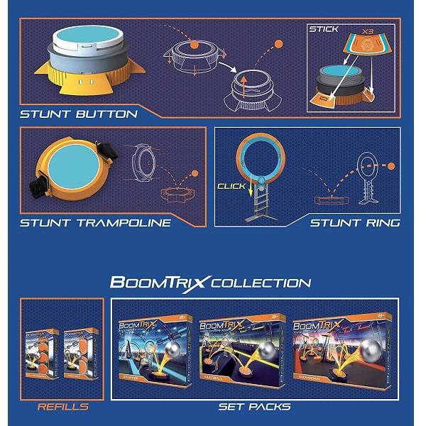 A BoomTrix Trambulinos golyópálya működésén keresztül sok izgalmas láncreakciót tapasztalhatsz meg. Ha az összes pályaelemet optimálisan helyezed el, akkor megfigyelheted a golyókat hogyan ugrálnak, menő láncreakciót váltva ki. Rakd össze saját trambulin pályádat, hogy minél hosszabb útja legyen a golyónak!