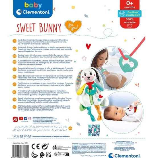 Lágy színeivel színeivel, puha anyagával a Clementoni Baby plüss nyálkendő rágókával - nyuszi hívogatóan hat a kicsik érzékszerveire. Az elsősorban morzsolgatható játék, a figura felfedezésére ösztönzi tulajdonosát. Nyakában egy szilikon medál, ami a fogzásban lévő babák számára rágókaként funkcionál.