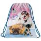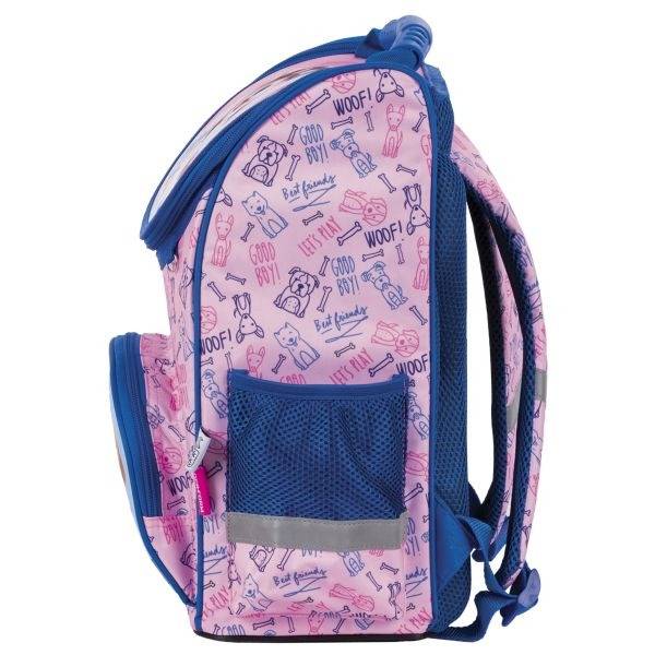 A kutyás mintával készült merevfalú ergonomikus iskolatáska kék és rózsaszín színvilága látványos, és divatos. A lányos iskolatáska elején kiskutyák pózolnak egy élethű, művészi képen.