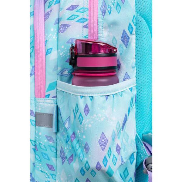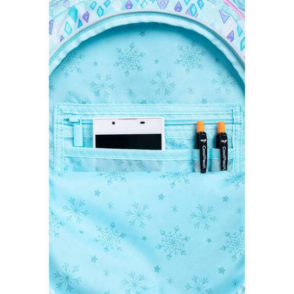 Világoskék, lila színvilága, jégkristályos mintája teszi egyedivé ezt a Disney mesefigurás, FROZEN hercegnős Coolpack ergonomikus iskolatáska hátizsákot. Az anatómiai kialakítású iskolatáska elején Elsa és Anna látható.