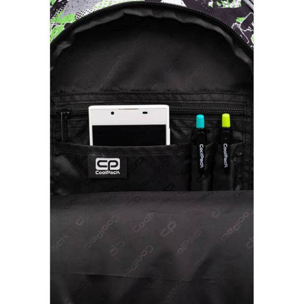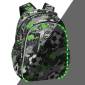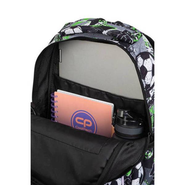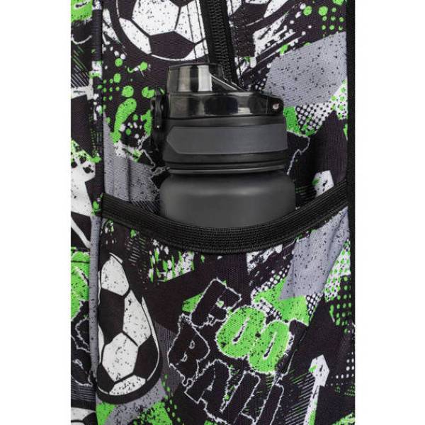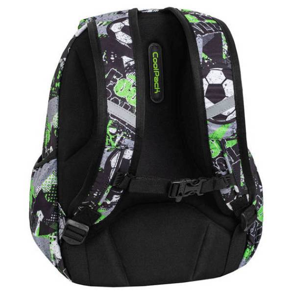 Zöld, fekete, szürke színvilág és focilabdás minta, feliratok díszítik ezt a világítós Coolpack focis iskolatáska hátizsákát.