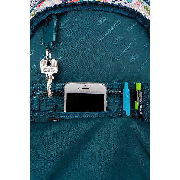 Pasztell színvilága, élénk, virágos leveles mnitája elvarázsol ennek a hőtároló rekesszel rendelkező CoolPack iskolatáska hátizsáknak.