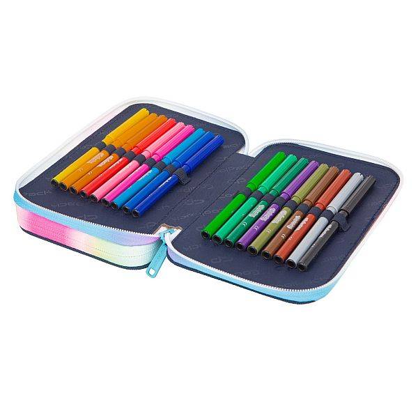 – A tolltartó felszerelt, tartalma 1 db grafit ceruza, 1 db golyóstoll, 12 db színes ceruza, 18 db filctoll, vonalzó, radír, hegyező