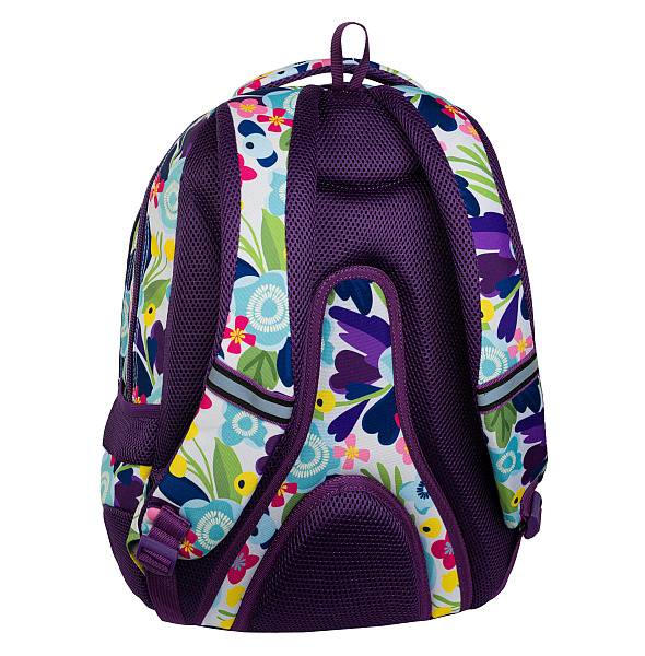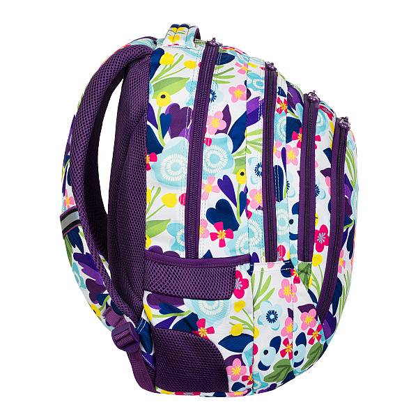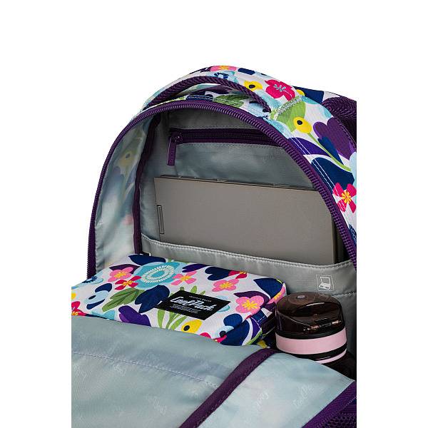 Lila szegélyek és élénk színű virágok teszik divatossá ezt a nagyméretű, jól pakolható CoolPack virágos iskolatáska hátizsákot.
