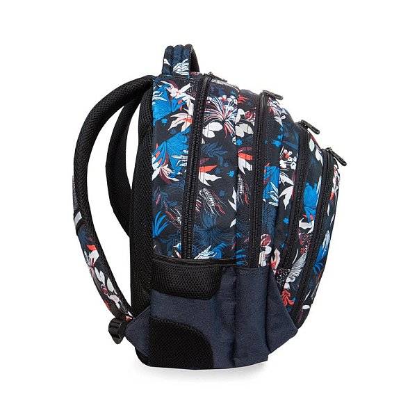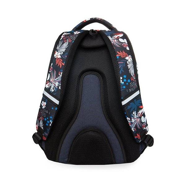 Az ergonomikus kialakítású CoolPack virágos iskolatáska hátizsák DRAFTER - Ocean Garden csinos virágokkal mintázott, kék, fehér, bordó színvilágú.