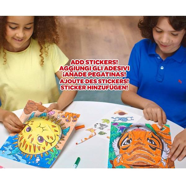 Ha kiszínezted a Crayola filctollakkal 3 háttér egyikét, valamint a 3D-s hatáshoz szükséges egyik lapot, akkor pattintsd ki a 3D-s lap egyes részeit, és az utasításoknak megfelelően a füleket a kijelölt helyekre illeszd be, és már kész is a mestermű. A dobozban található matricákkal tovább díszítheted kedved szerint a képedet.