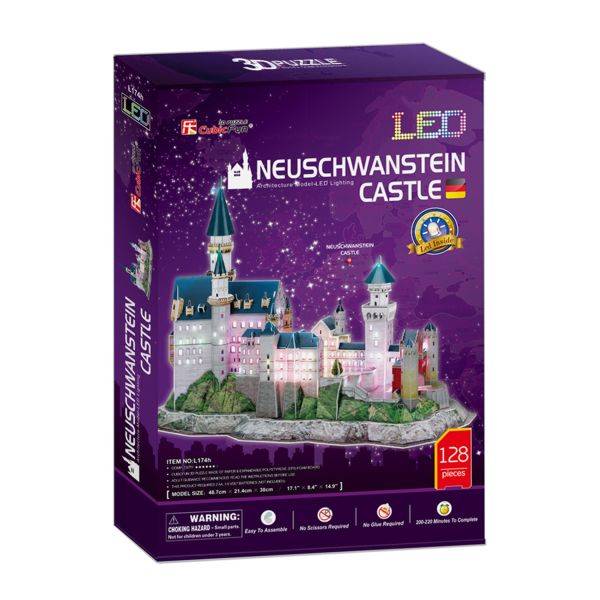 A CubicFun 3D LED puzzle 128 db-os Neuschwanstein kastély egy izgalmas kihívás elé állítja a gyerekeket. A 3D vékony habszivacsból készült kirakós kiváló szórakozási lehetőséget nyújt, az elkészült remekmű pedig látványos dísze lehet a szobának. Különlegessége, hogy LED világítást tartalmaz, mely elemmel működtethető.