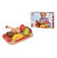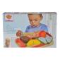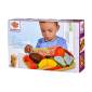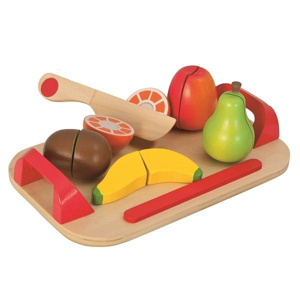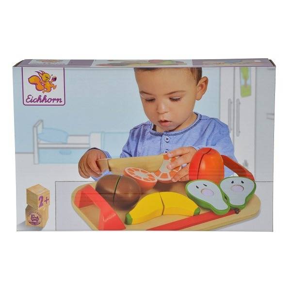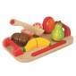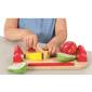 A szett 6 színes fa ételt tartalmaz, amelyet a mellékelt késsel felszeletelhető. A tépőzárnak köszönhetően újra egésszé állnak össze, hogy ismételten neki lehessen kezdeni a feladatnak.