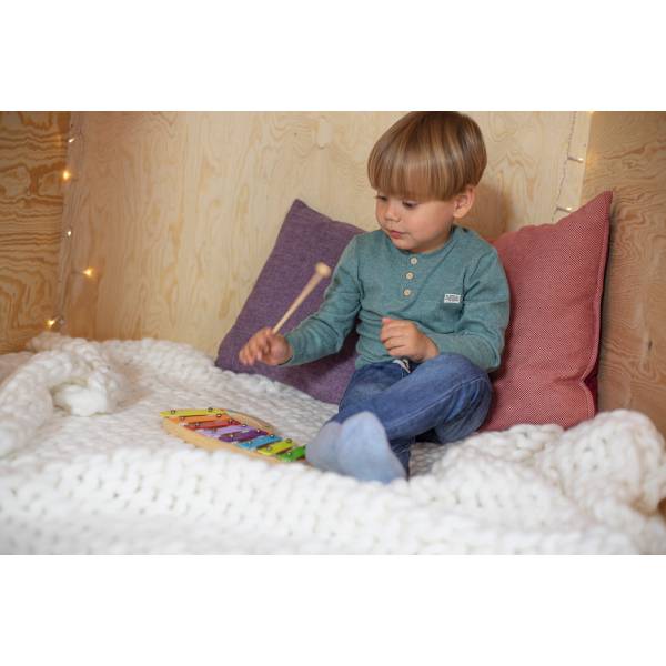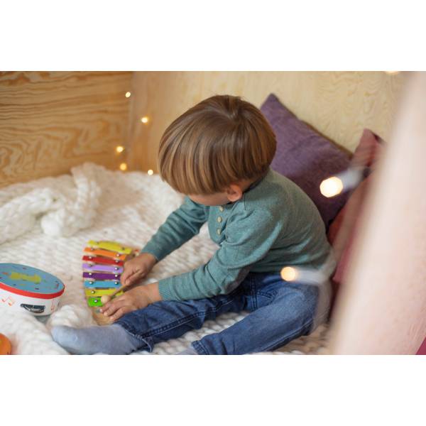 A színes fából készült hangszer gyerekeknek lett tervezve, hogy megtapasztalják a hangok és a ritmus világát. A játék 8 hang lejátszására képes, a csomag kottát is tartalmaz.