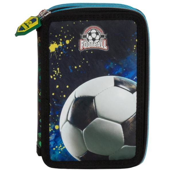 Ez a kék focis tolltartó garantáltan elnyeri minden labdarúgásrajongó kisfiú tetszését! Előlapján egy hatalmas focilabda látható festékpaca-szerű háttérrel, ami vagány és figyelemfelkeltő megjelenést kölcsönöz. A kétemeletes kialakítás rengeteg helyet kínál az írószerek számára, így a kisiskolások könnyedén rendszerezhetik felszerelésüket. A gumipántok segítenek az eszközök rögzítésében, így minden átlátható és rendezett marad. A tolltartót írószerekkel felszerelve szállítjuk – a focit kedvelők számára igazán izgalmas választás.