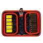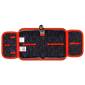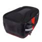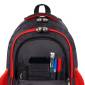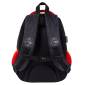 A Járműves mintájú, fekete, piros színvilágú iskolatáska szett része az ergonomikus iskolatáska, a kihajtható tolltartó és a tornazsák.