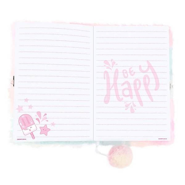 A kulccsal zárható szőrmés kis notesz A5 méretű, vonalas, a borító belső oldala színes mintás.