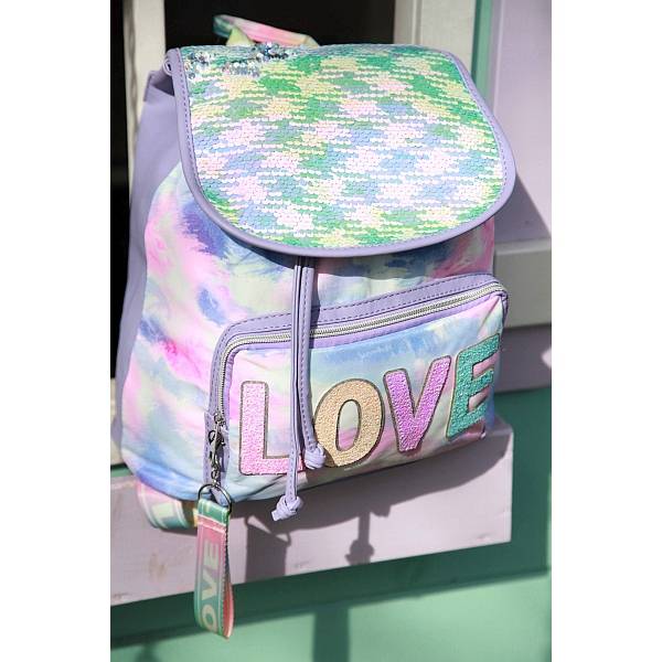 Az egy rekesszel rendelkező hátizsák könnyen tisztítható, műbőr-szerű anyagból készült, ombre színátmenetes hatással. Nagy rekesze zsinór összehúzásával záródik, ráhajtható teteje flitterekkel díszített. Csillámos LOVE feirattal a kisebb első zseben, melybe minden apróság belefér.