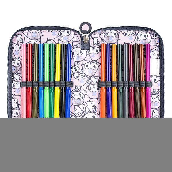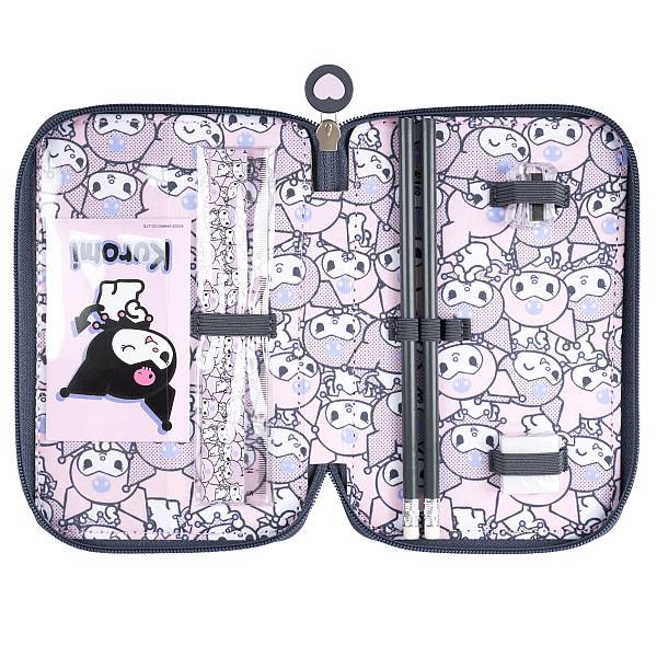 Ez a lilás-rózsaszínes Kuromi mintás tolltartó stílusos és vidám kiegészítő minden Sanrio-rajongó lánynak. A mintáján ismétlődő Kuromi figurák és a fedélen látható nagyobb Kuromi-nyuszi igazán egyedi megjelenést biztosítanak. A csintalan, fekete sapkás karakter bohókás stílusával feldobja a tanulást, miközben a tolltartó praktikus kialakítása lehetővé teszi az írószerek rendezett tárolását.