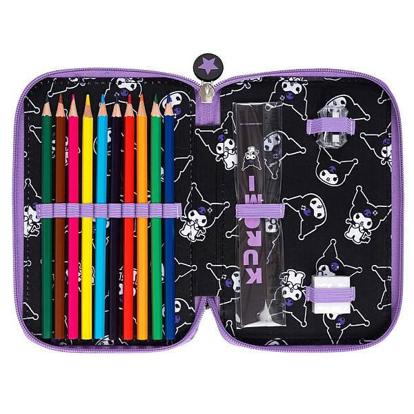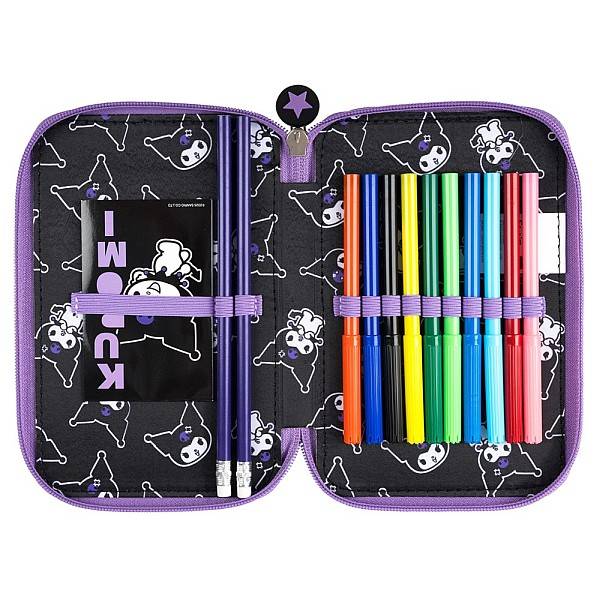 A lila és fekete színvilágú Kuromi tolltartó minden trendi lány kedvence lesz! Mintáján a népszerű japán mesekarakter, Kuromi ismétlődik, játékos és vidám hangulatot teremtve. A fedélen egy nagyobb Kuromi-figura és a karakter neve díszeleg, amely egyedi, stílusos megjelenést kölcsönöz a tolltartónak. A csintalan, fekete sapkás nyuszi a Sanrio-univerzum egyik legnépszerűbb szereplője, így ez a tolltartó tökéletes választás minden rajongó számára, aki szereti a különleges, trendi kiegészítőket.