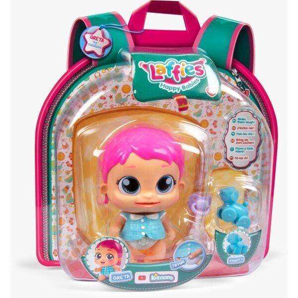 A reklámokból ismert Laffies kacagó babák különleges kis jövevények. 5 féle interaktív ponttal rendelkeznek, és különféle arckifejezésekre képesek. A baba akár okostelefonról is irányítható egy applikáció segítségével. Greta a kreatív pink hajjal érkezik hozzád egy édes kis táskában, amiben megtalálsz több eszközt is, ami a kisbaba gondozásához szükséges.