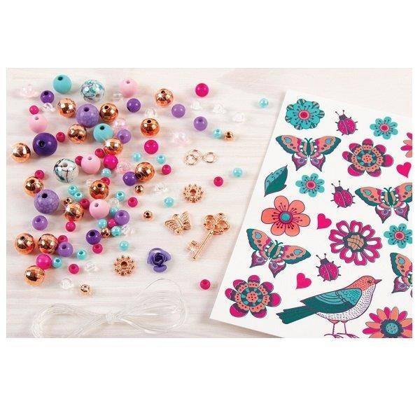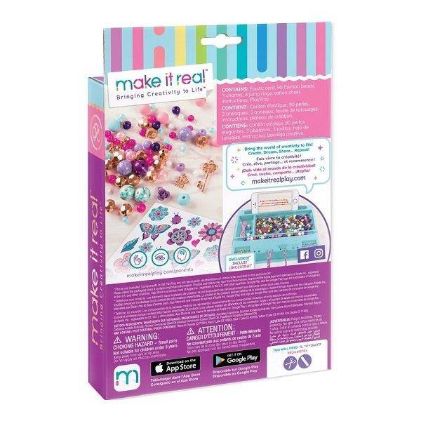 Romantikus hangulatú, virágokkal, pillangóval díszített karkötőket készíthetsz ezzel a Make it Real Karkötő készítő szettel. Engedd szabadjára kreativitásodat, használd a fantáziádat! Alkoss kedvedre mesés karkötőket! A rugalmas zsinórra fűzz színes gyöngyöket, díszítsd virágos medállal, kis kulcsocskával! Tervezz magadnak vagy ajándékba karkötőt! A Make it Real készletben három karkötőhöz elegendő alapanyagot találsz. Ha már elfogytak a gyöngyök, a leírás szerint további ékszereket készíthetsz más alapanyagokból.