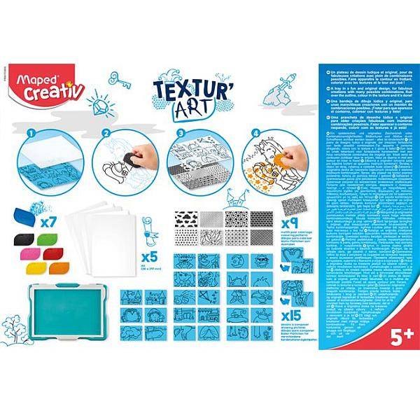 A MAPED CREATIV Textur Art rajztábla különleges élményt nyújt a kis művészeknek: a gyerekek dörzsöléses technikával varázsolhatnak mintás, egyedi képeket. A készlet többféle textúralapot és sablont tartalmaz, így könnyedén kombinálhatók a figurák, hátterek és formák.