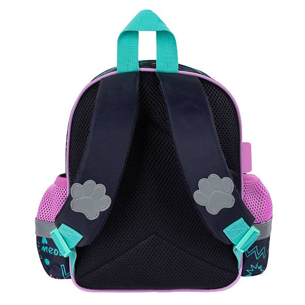 A cicás kis táska 2 rekeszes, melyek gumiemblémás cipzárral záródnak. Két oldalán hálós zseb van, melyben italt és kulacsot tudsz elhelyezni. A hátizsák vállpántjai szükség szerint állíthatóak. Hátrésze párnázott és kényelmes.