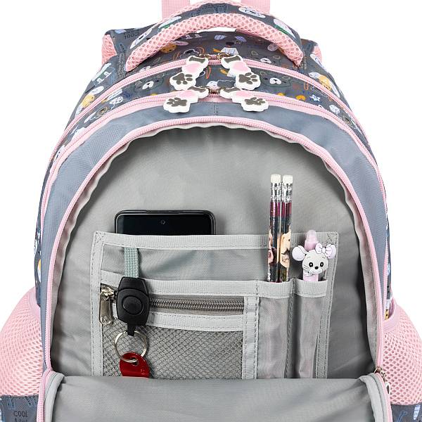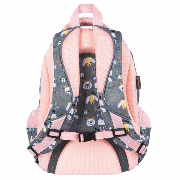 Ez a kutyás iskolai hátizsák minden kisállatkedvelő lány szívét elrabolja! A rózsaszín és szürke színek kombinációja vidám, barátságos hangulatot sugároz, a mintáján mosolygó pomerániai törpespicc pózol, amely különösen aranyossá teszi a táskát. Az ergonomikus kialakítás kényelmes viseletet biztosít az 1–3. osztályos lányok számára, a párnázott hátoldal és állítható vállpántok pedig optimális tartást nyújtanak. A tágas rekeszek és praktikus zsebek segítségével minden iskolai felszerelés rendezetten és biztonságosan elfér benne.