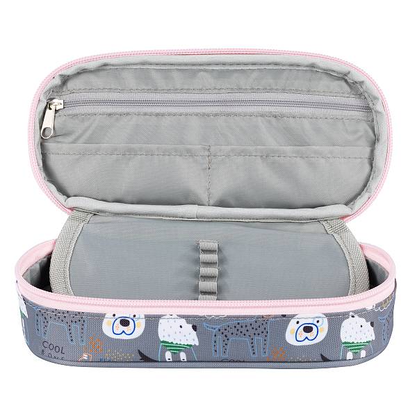 Ez a vidám, kutyás tolltartó minden kisállatkedvelő kislány kedvence lesz! A rózsaszín és szürke színek kombinációja barátságos hangulatot áraszt, a mintáján pedig egy mosolygó pomerániai törpespicc látható, amely különösen aranyossá teszi a tolltartót. Belsejében az írószerek rendszerezés nélkül helyezhetők el, így tágas kialakítása miatt elsősorban nagyobb iskolások számára ideális választás. Strapabíró és praktikus, hosszú távon hű társ az iskolai mindennapokban.