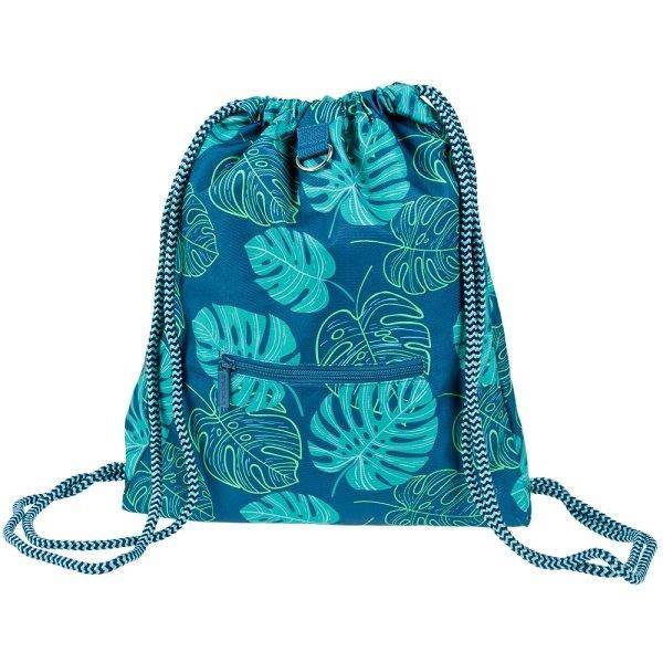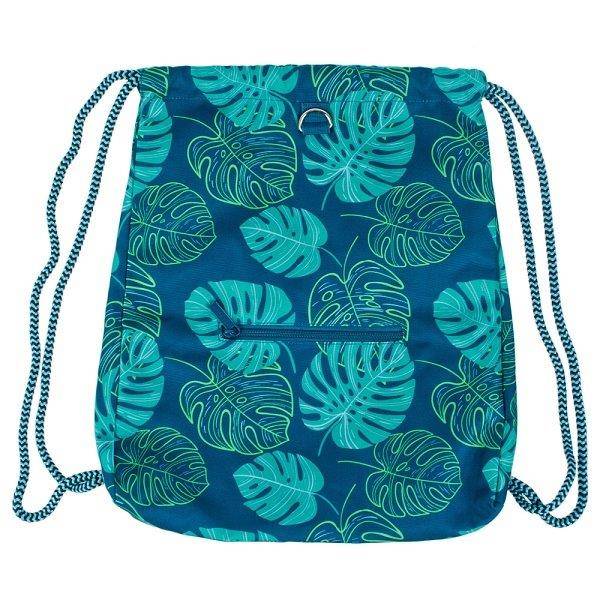Látványos türkiz színű tornazsák lányoknak, mely különleges pálmalevelekkel díszített.