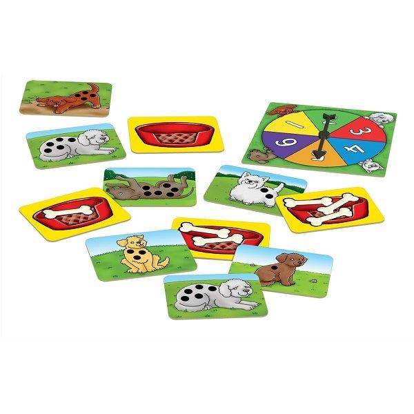 Gyűjtsd össze a pöttyös kutyusokat és aszámold meg a jutalomfalatokat ebben a szórakoztató társasjátékban. Csak pörgess a kerékkel, majd keresd meg a kapott számnak megfelelő pöttyel rendelkező kutyust. A kártyákon cuki állatok szerepelnek. A gyerekek szinte észrevétlen tanulják meg így a számokat.