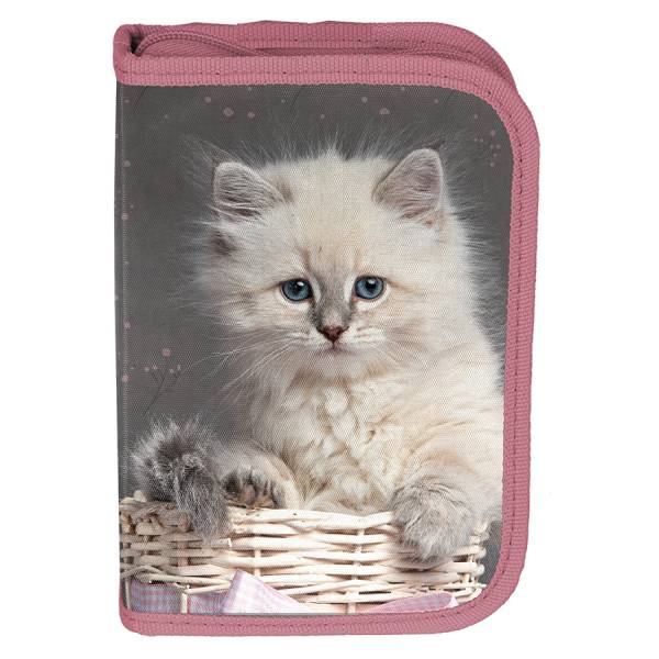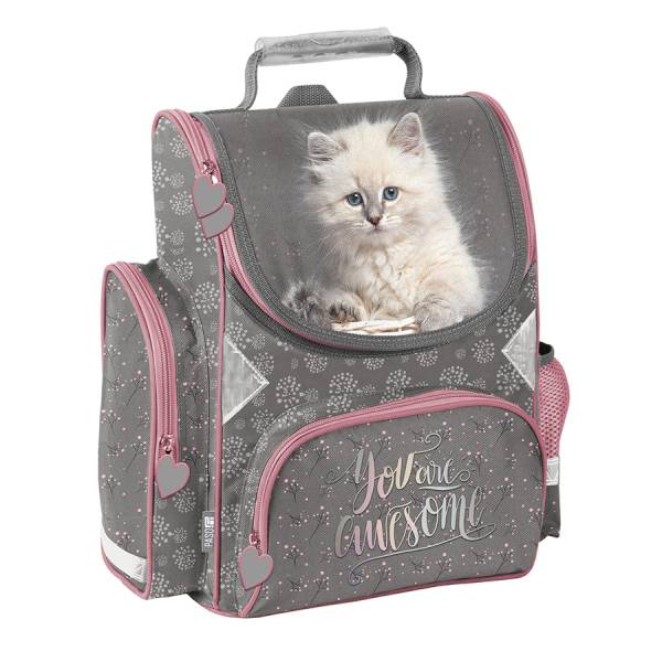 Fehér bolyhos kiscica üldögél egy kosárban a cuki cicás iskolatáska elején, körülötte apró virágminta. A kiscicás mintával készült dobozos iskolatáska lányoknak ajánlott, elsősöknek kifejezetten ideális választás.