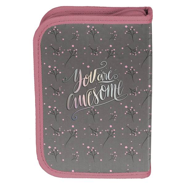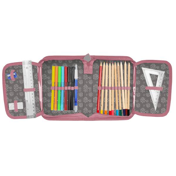 - A kihajtható tolltartó felszerelt: 7 db filctoll, 1 db grafit ceruza, 9 db színes ceruza, 2 db vonalzó, 1 db hegyező, 1 db radír, 1 db toll, szorzótábla, órarend