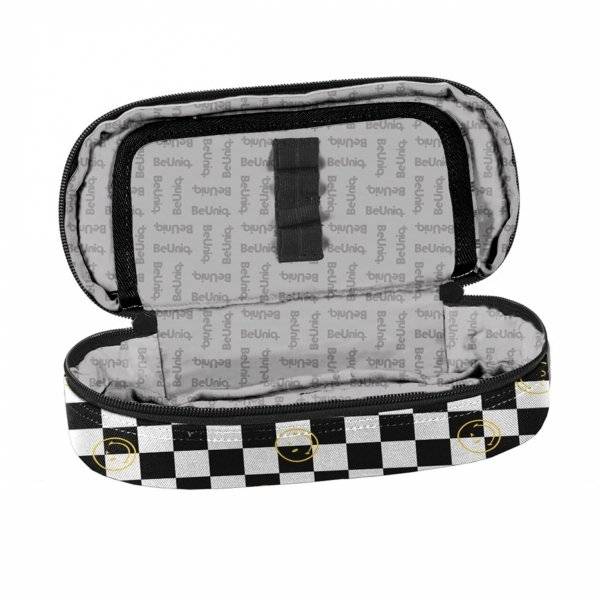 A pepita mintás, smiley díszítésű tolltartó tökéletes választás azok számára, akik kedvelik az egyedi, mégis praktikus iskolai kiegészítőket. Cipzárral záródó kialakítása biztosítja a könnyű használatot, belsejében egy kihajtható fül található. Az egyik oldalon cipzáras zseb segíti a kisebb eszközök tárolását, míg a másik oldalon gumipántok gondoskodnak az írószerek rögzítéséről. Egyrekeszes belső tere lehetővé teszi, hogy a különböző formájú eszközök rendezetten és kényelmesen elférjenek.