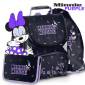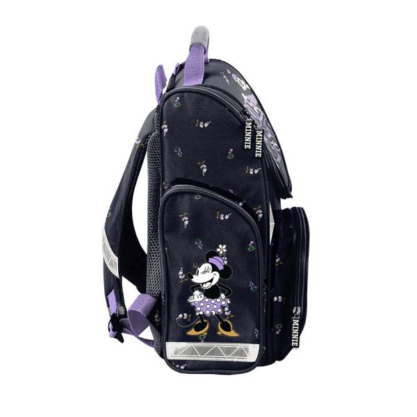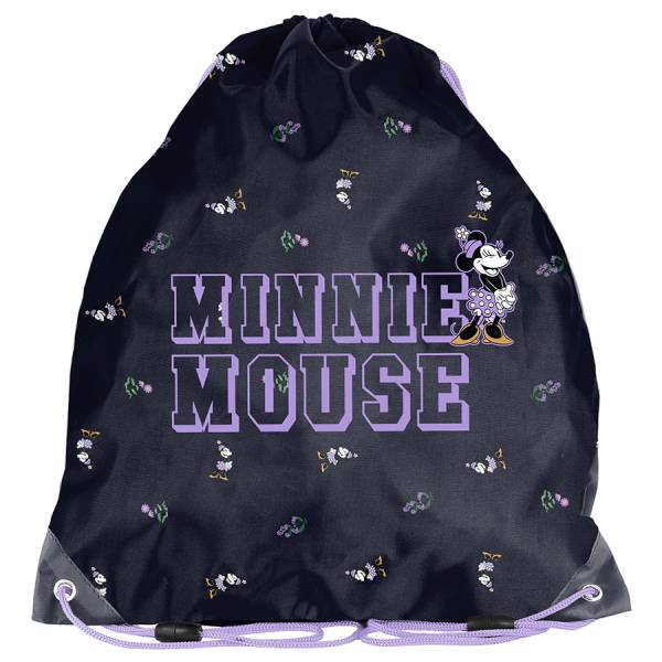 Minnie vidáman pózol a lila virágok között hajában a már jól ismert masnival. A sötétkék iskolatáska mintáján továbbá apró virágok is láthatók az egér figurák között.