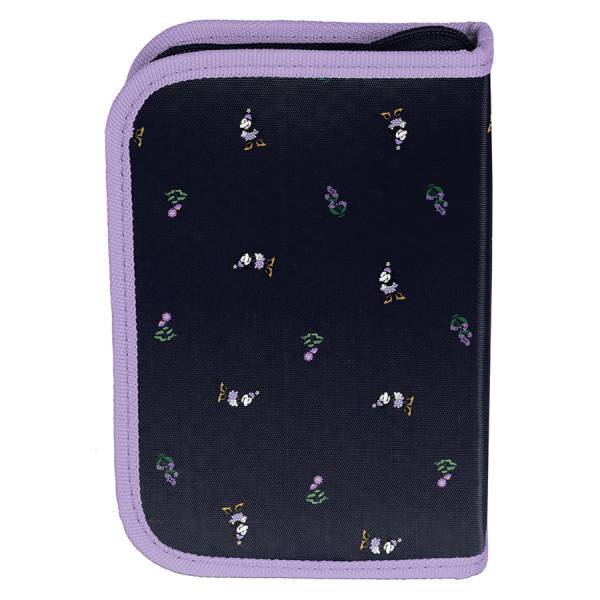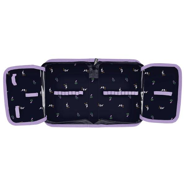 – A kihajtható tolltartó nem felszerelt. A fóliázott karton belső rész szintén mintázott. A kihajtható füleken gumipántok segítségével rendszerezhetőek a ceruzák. 18 gumipánt található a ceruzák, tollak részére, emellett helyet kaphat a vonalzó, radír, faragó és órarend is a tolltartóban.