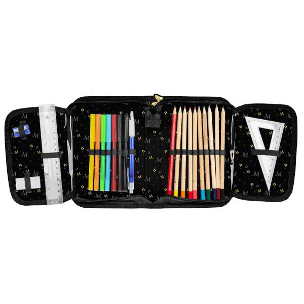 - A tolltartó felszerelt, 7 db filctoll, 1 db grafit ceruza, 9 db színes ceruza, 2 db vonalzó, 1 db hegyező, 1 db radír, 1 db toll