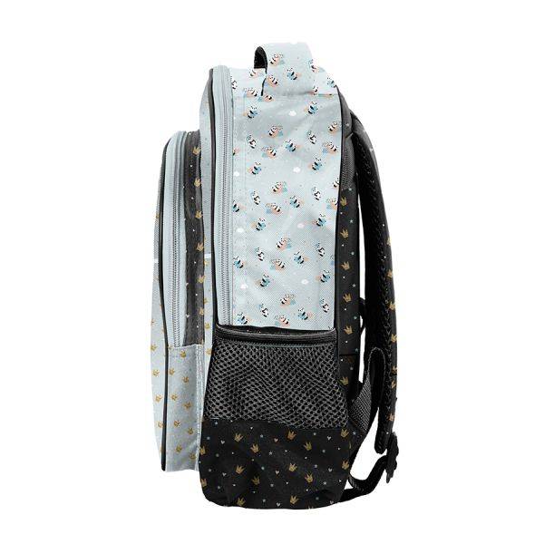 A színes táska 2 rekeszes, melyek gumiemblémával díszített cipzárral záródnak. Mindkét oldalán hálós zseb van. A hátizsák vállpántjai szükség szerint állíthatóak.