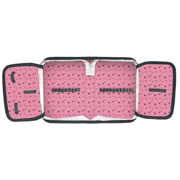 A minőségi kihajtható tolltartó praktikus kialakítású, könnyen kezelhető, így első osztályos kortól is ajánljuk. A tolltartó belsejében színes gumipántok alá rögzíthetőek az írószerek, és helyet kapott benne négy nagyobb pánt is, a radír, faragó, vonalzó tárolására.
