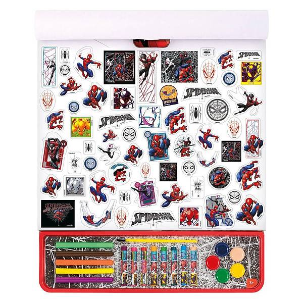 Giga kreatív szett 5in1 - Spiderman mintás rajzkészlet. Remek szórakozást nyújt minden fiúnak ez a matricás kifestőkönyv, amelyben kedvenc Spiderman szuperhősük várja, hogy végre színt kapjon, és matricával legyen díszítve. A Pókemberes giga kreatív szett 5 az 1-ben lehetővé teszi, hogy számos alkotási területen kipróbáld magad. Fess, színezz vagy rajzolj zsírkrétával! A színek és minták sorozatának csak a képzeleted szabhat határokat.