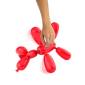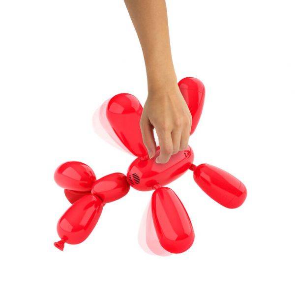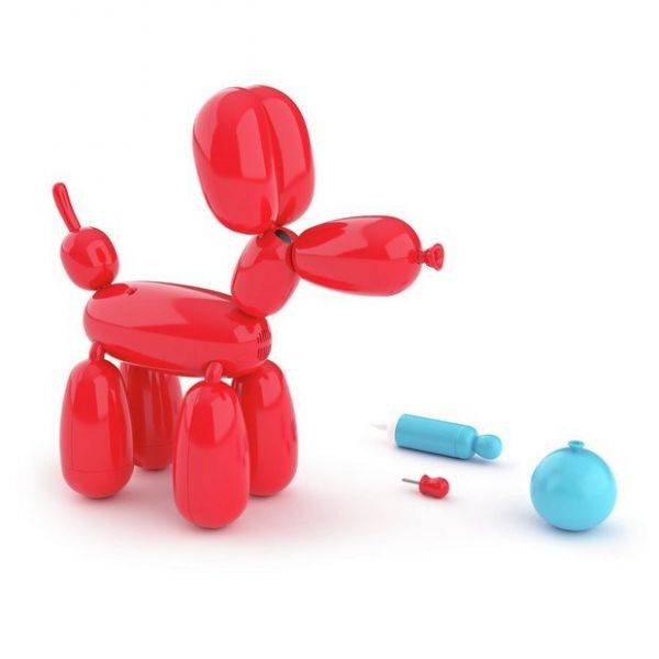Az interaktív lufikutya fényes piros színű műanyagból készült, több mint 50 hanggal és interakcióval, valamint több érintésérzékelővel rendelkezik.