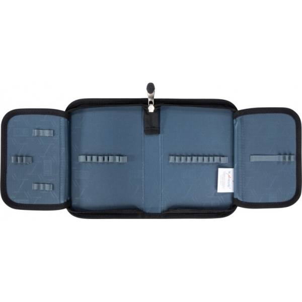 A divatos, mintás tolltartóban 24 darab írószer elhelyezésére van lehetőség, emellett helyet kaphat a vonalzó, a radír és hegyező is.