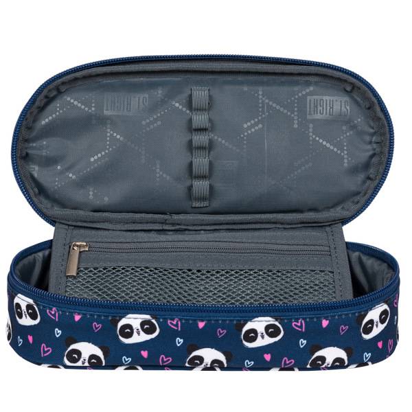 Rózsaszín szívecskét tart a kezében ez a cuki panda bocs a csíkos, kék-fehér színvilágú panda mintás St. Right ovális tolltartón. A tolltartó hátoldala szintén pandás.