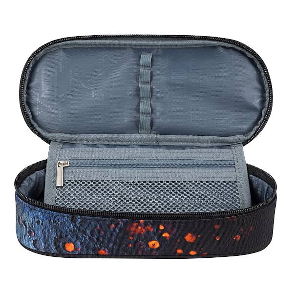 Ez a látványos ovális tolltartó fiúknak különleges mintájával tűnik ki: egy vulkánként fortyogó bolygó díszíti. A bedobálós kialakítás elsősorban felsős gyerekek számára előnyös, belseje pedig praktikus és átlátható. Dupla cipzárral záródik, benne egy nagy rekesz és egy kisebb kihajtható fül található, amelyen gumipántok és cipzáras zseb segítik az írószerek rendszerezését.