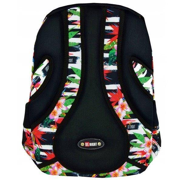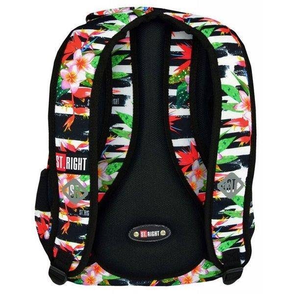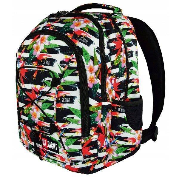 Vidám hangulatú St. Right virágos iskolatáska hátizsák - Tropical Flowers, melyen a fekete, fehér csíkozású háttéren trópusi virágok láthatók. A mutatós, hátizsák formájú iskolatáskát lányoknak ajánljuk, akik szeretik a feltűnő mintákat, a divatot. A trendi iskolatáska három rekeszében minden iskolaszered belefér majd.