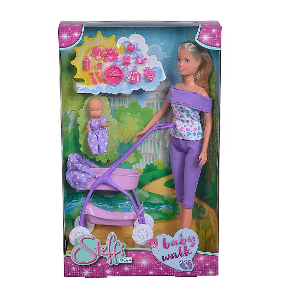 A 29 cm magas Steffi baba végtagjai mozgathatóak, hosszú haja fésülhető.