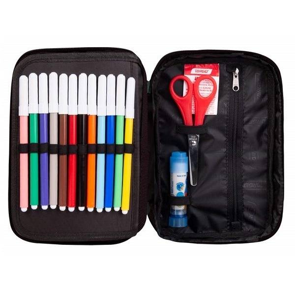 Iskolatáska szett tartalma az ergonomikus iskolatáska és a belsőszintes felszerelt tolltartó.